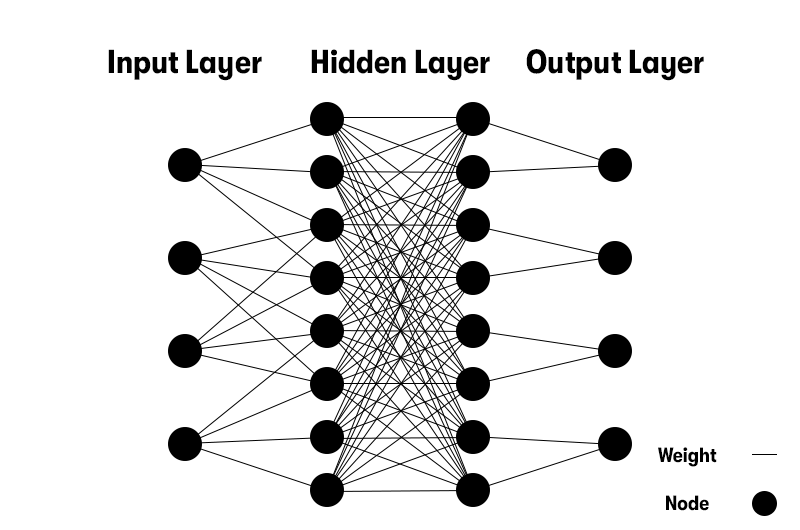Inside the network are thousands of nodes (weights).